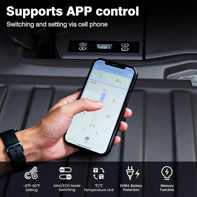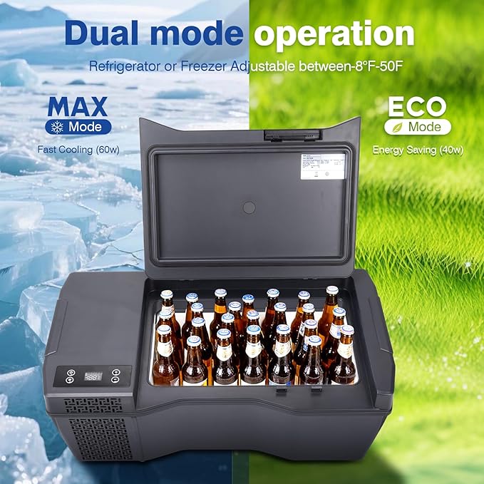 - 【Dual Smart Control System】 Operate via digital touch panel or Bluetooth APP. Easily adjust temperature, switch MAX/ECO cooling modes, and customize voltage protection settings. Enjoy precise control whether you’re inside the cab or outside the vehicle.