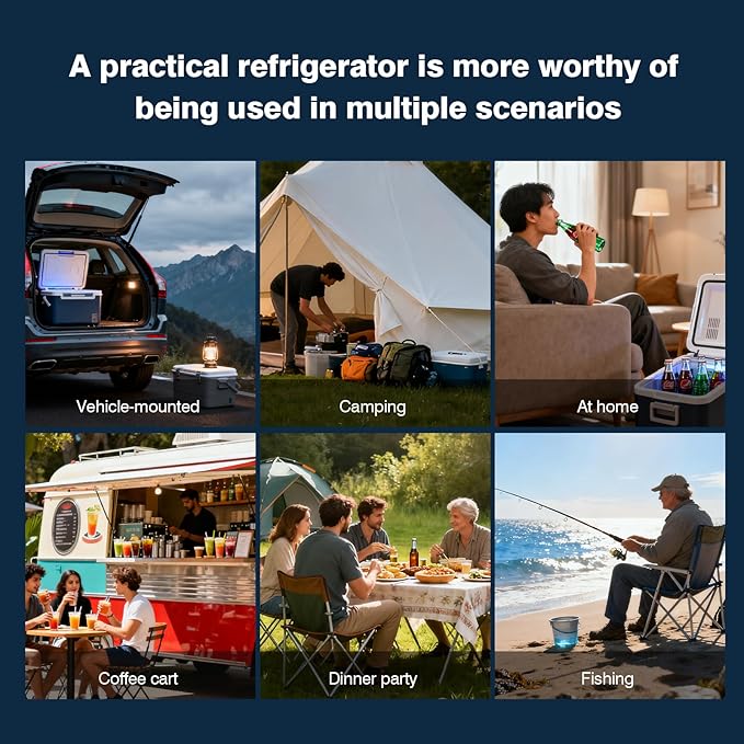 - 【Powerful Compressor Cooling】 Equipped with a high-performance compressor and thick insulation, this fridge rapidly cools from 50°F to -8°F (-22°C~10°C) within minutes. Maintain stable temperature even under extreme outdoor heat with ultra-low power consumption — only 0.21kWh/24h.